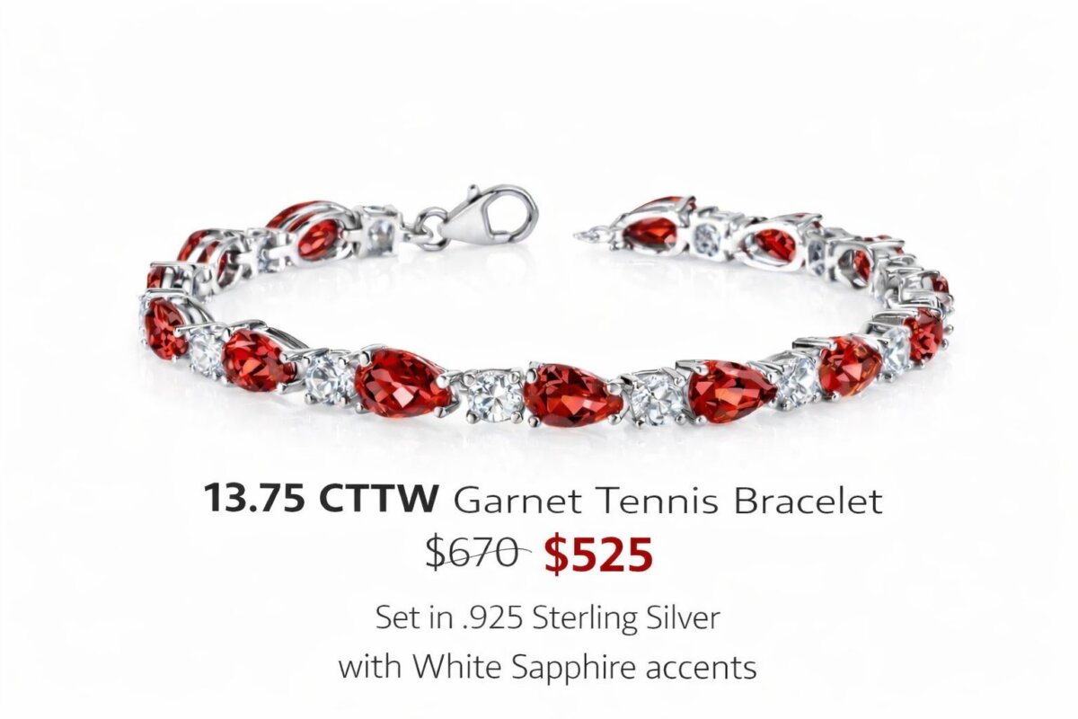 Beautiful garnets accented by white sapphires add to this stunning design. Set in .925 Sterling Silver and 7.5″ in length. Sealed in 950 Platinum