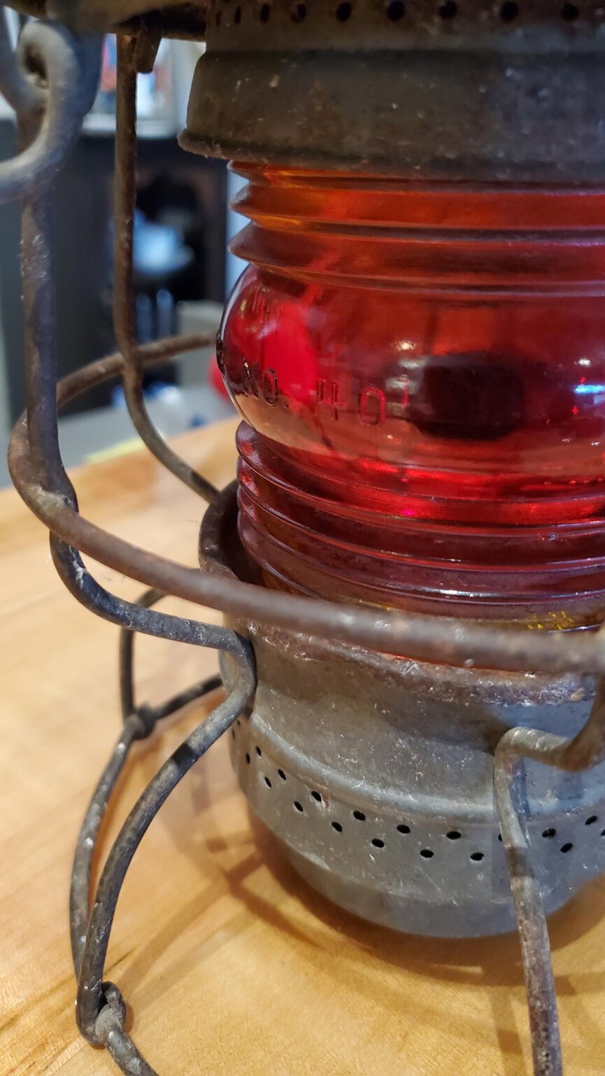 Fitted to the lantern is a ribbed red Embury No. 40 globe, a period-correct replacement made by the Embury Manufacturing Company of Rochester, New York. The deep color and heavy ribbing of this globe create a beautiful, saturated glow when lit, making it a striking display piece even outside a railroad context. Red globes served as stop, danger, and marker signals—simple but critical visual communication in the rail industry before electric systems took over.