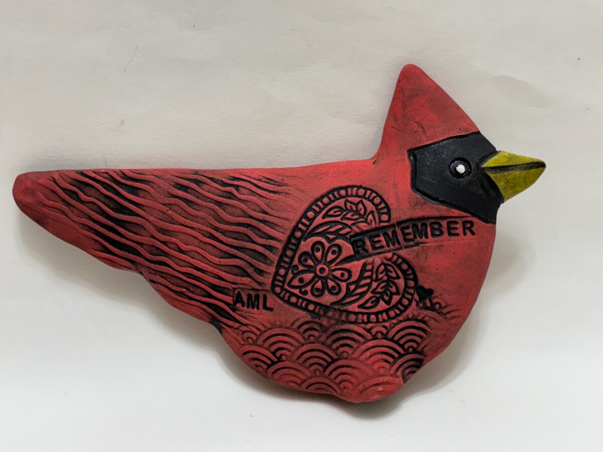 Brighten your garden with the Ceramic Garden Stake Cardinal. This handcrafted piece features vibrant red color with subtle black accents, adding a lively touch to any outdoor space. Made from durable ceramic, it is stamped with “Remember” on one side and “I’m Here” on the other side. Includes a non-rusting metal stake and measures approximately 8” x 5” x 2”.