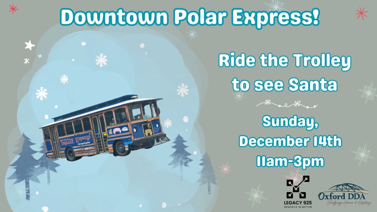 Embark on The Downtown Trolley “Polar” Express journey beginning from Legacy Center going through Downtown Oxford and arriving just in time to meet Santa!