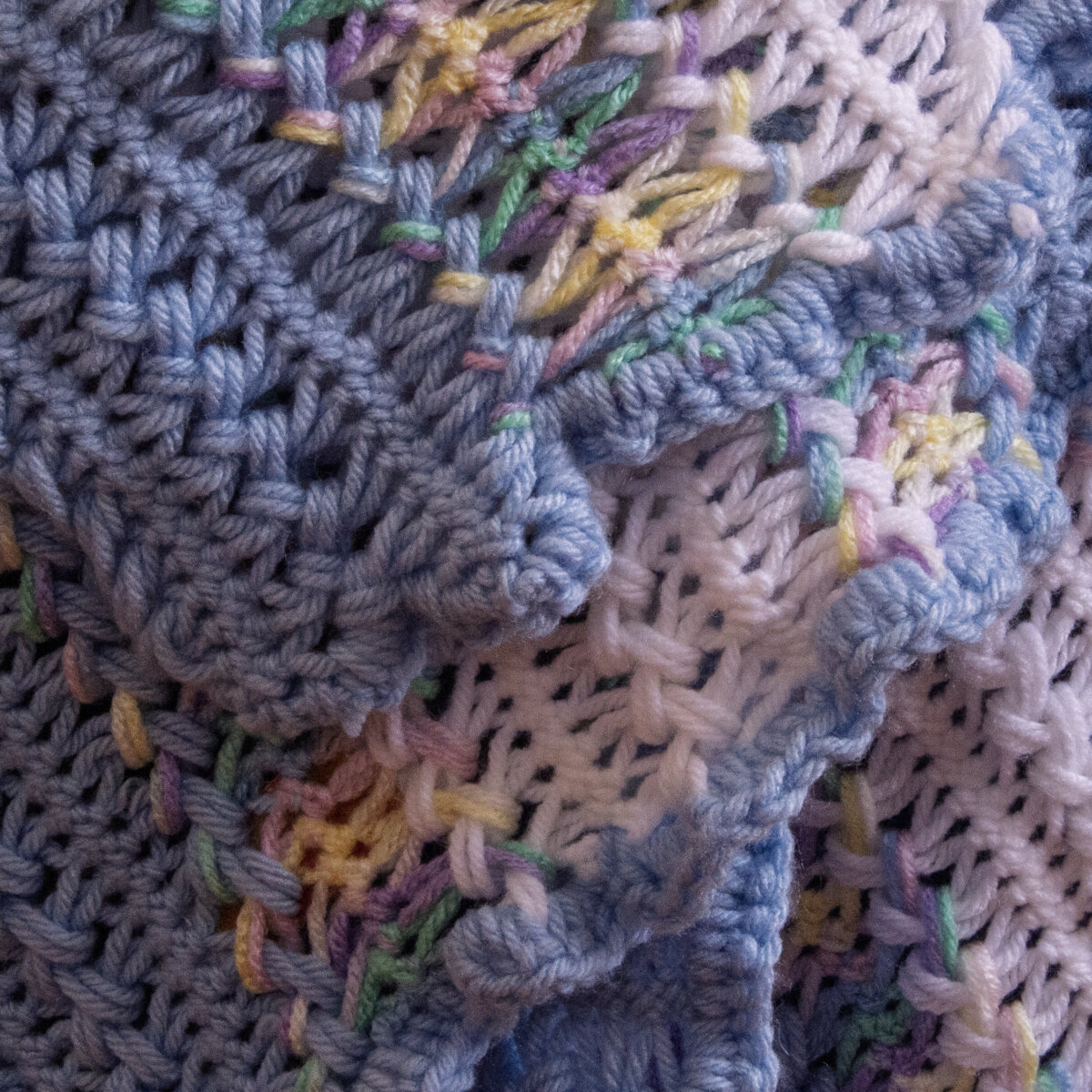 HighlandHair Pin Lace crochet stiches. Soft Afghan made with acrylic yarn. Approximately 36” X 36”. Machine wash and dry. One of a kind in blue, pink and purple soft yarns. Wonderful as a lap or baby blanket.