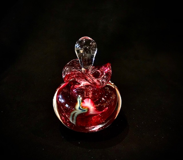 This signed Jeremiah Lotton art glass perfume bottle (Lotton Studios, 1997) features a compact rounded form encasing a radiant rose-pink interior ribbon motif within clear glass for depth and optical clarity. A softly flared rim supports a clear teardrop stopper that completes the elegant silhouette. Hand-blown in their Illinois Studio during the Lotton studio’s mature period, the base is signed and dated 1997.