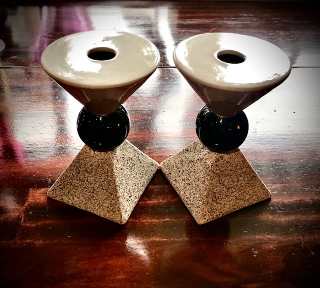 This pair of ceramic candlestick holders by Michael Duvall dates to the late 20th century. The design uses a geometric post-modern form with speckled pyramid bases, glossy black spheres, and white flared candle cups that create a sculptural stacked profile.