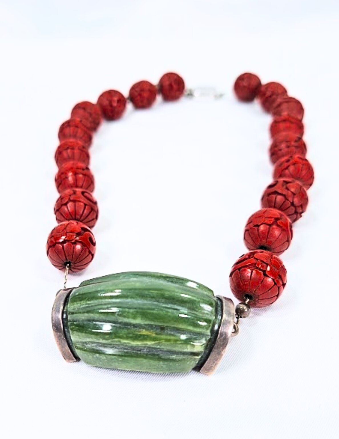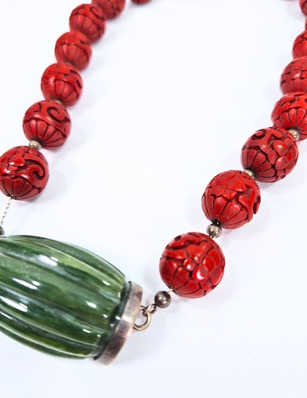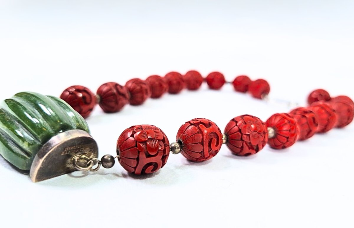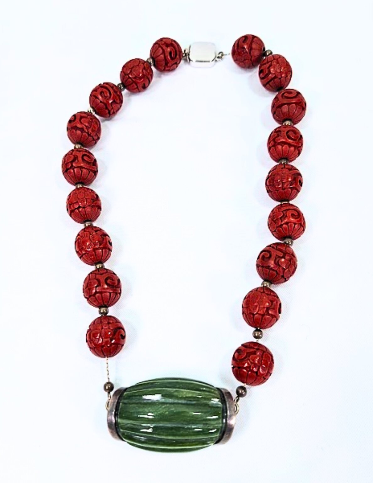 M&J SAVITT New York Necklace 16″ Inch – cinnabar carved beads on a link sterling chain with silver accent beads between each bead, linked to a 1.5″ carved green stone with sterling end caps clearly marked with M&J SAVITT – Sterling Clasp
