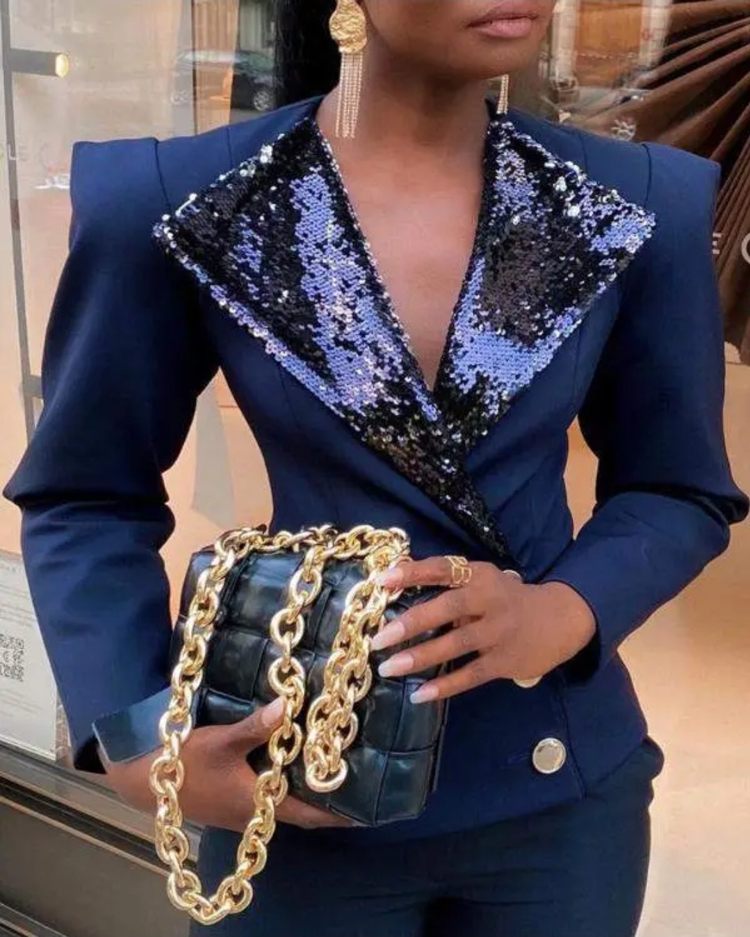 Classic, fitted blazer with sequin lapels for a true holiday look you’ll love!