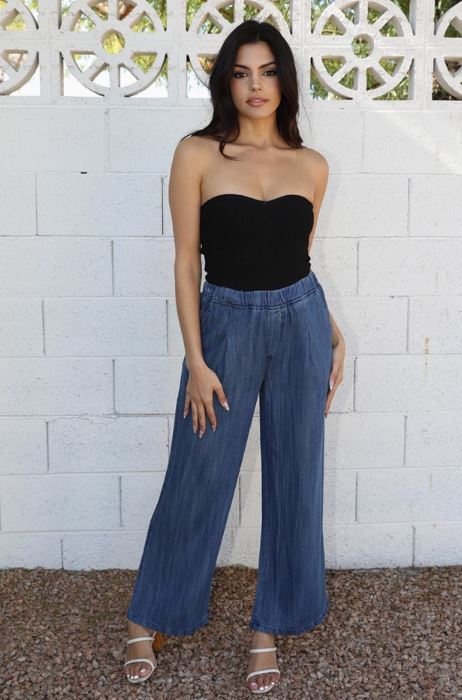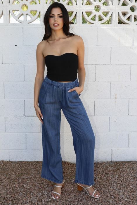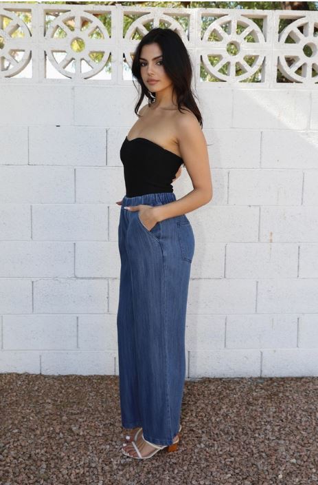 Experience the ultimate in comfort and style with our TENCEL Wide Leg Elastic Waist Pants with Pockets. These pants are perfect for work and everyday wear, offering a classic aesthetic with a modern twist. They feature a junior fit, a regular rise style, and come in a solid blue color that is sure to complement any outfit. The wide leg design falls at the ankle, providing a flattering silhouette. Made by Angie, a brand known for its bohemian and vintage influences, these pants are not only comfortable but also embody a well-traveled, romantic spirit.